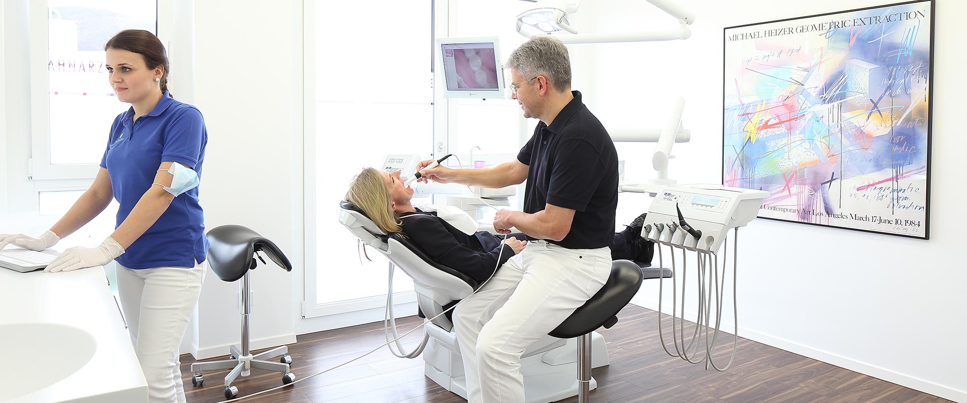 Durch den Einsatz einer Intraoralen Kamera ist es uns möglich, Ihnen Ihre Zähne aus der Perspektive zu zeigen, die normalerweise nur wir in Augenschein nehmen können. Sie können die Bilder Ihres Befundes direkt vor sich auf dem Monitor sehen.